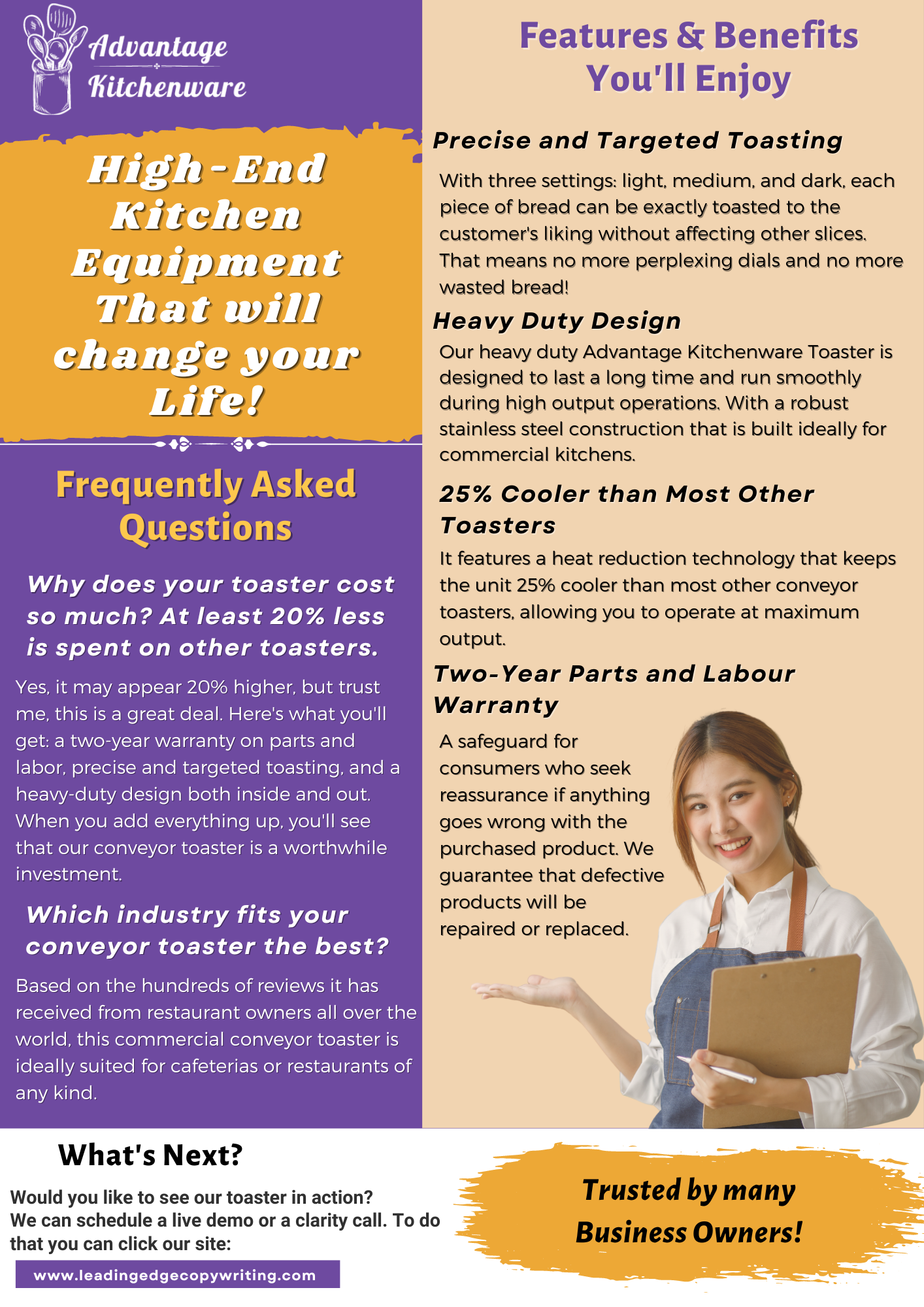 Below is the sample design of a One Sheet about the Advantage Kitchenware Toaster. Do you want that kind of design? Maybe just some information about your brand? Or both? We can do it all!